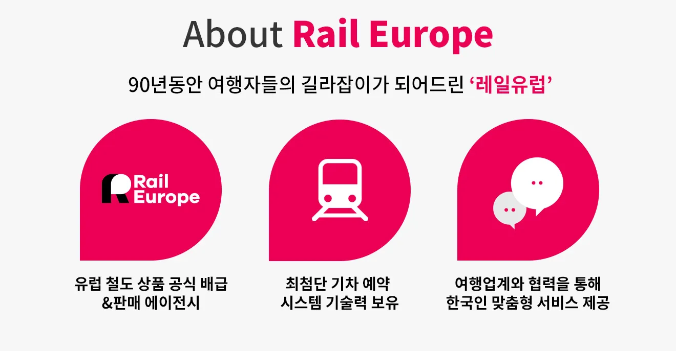 레일유럽은 90년 동안 여행자들에게 유럽 철도 상품을 전세계에 배급하며 홍보 마케팅을 하고 있습니다. 유럽의 각 철도청과 열차 회사 그리고 유레일 등 100여 개가 넘는 파트너사의 전세계 공식 배급사이자 공식 총판 에이전시입니다.
