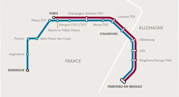 떼제베 프랑스-프라이부르크 열차는 프랑스 파리(Paris) - 독일 프라이부르크(Fribourg) 또는 프랑스 보르도(Bordeaux) - 독일 프라이부르크 구간을 초고속으로 운행합니다. 이 노선에는 인기 있는 지역인 샹파뉴(Champagne)와 스트라스부르(Strasbourg)도 포함되어 있습니다.